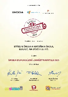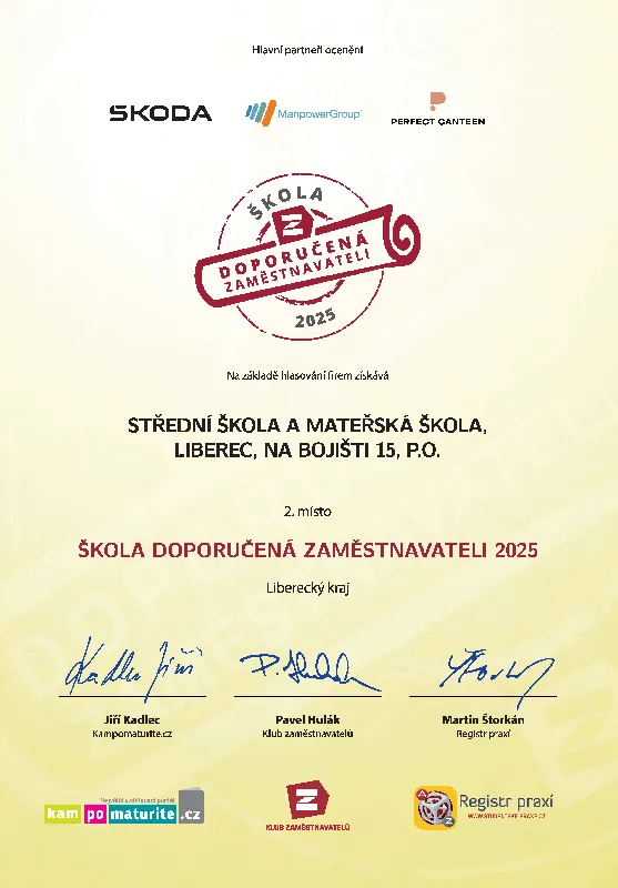 Naše škola rovněž na základě hlasování firem obsadila 2. místo v anketě Škola doporučená zaměstnavateli. Diplom spolu s dalšími oceněnými převzal na podiu ředitel SŠ a MŠ Na Bojišti dr. Krabs.